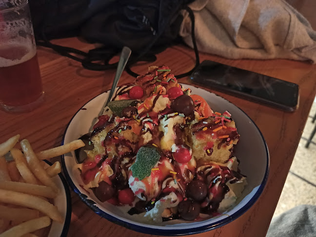 Delicious cheesy chips; son enjoyed the black bun burger too